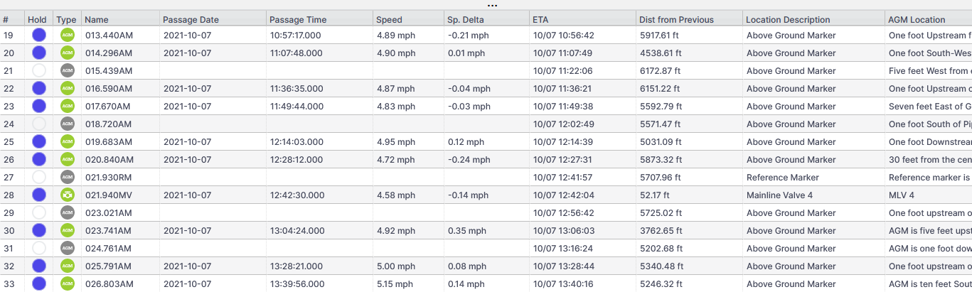 For manual entry, pig passage times are made by clicking into the time field and typing the time of passage. This action causes GlobalTrack’s simulation to update.